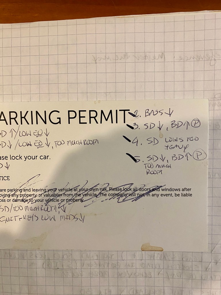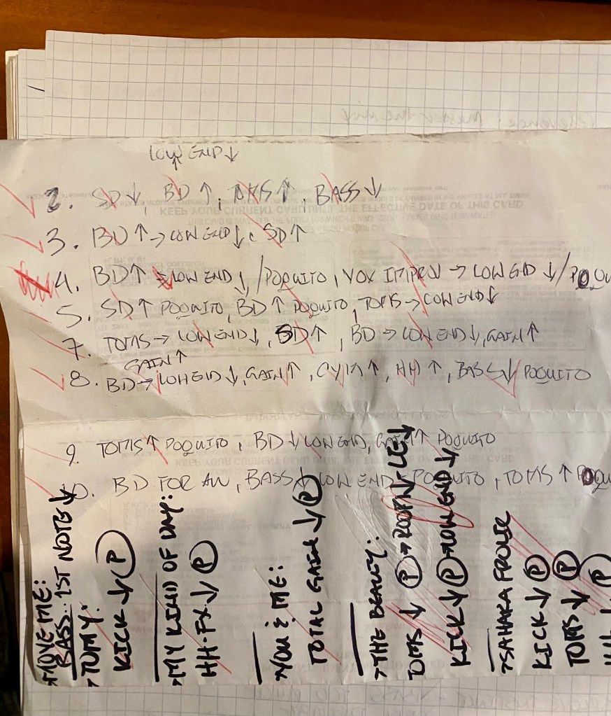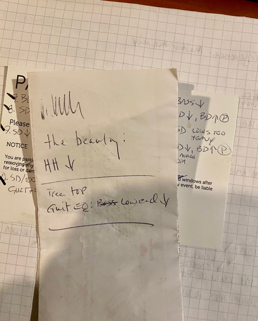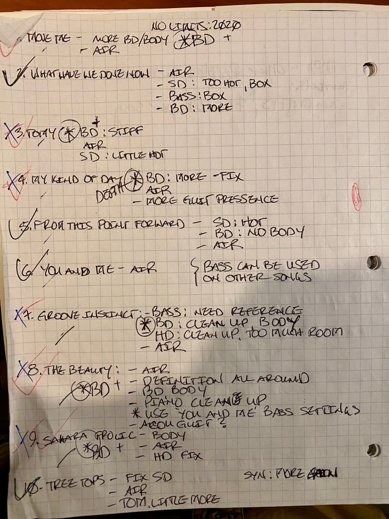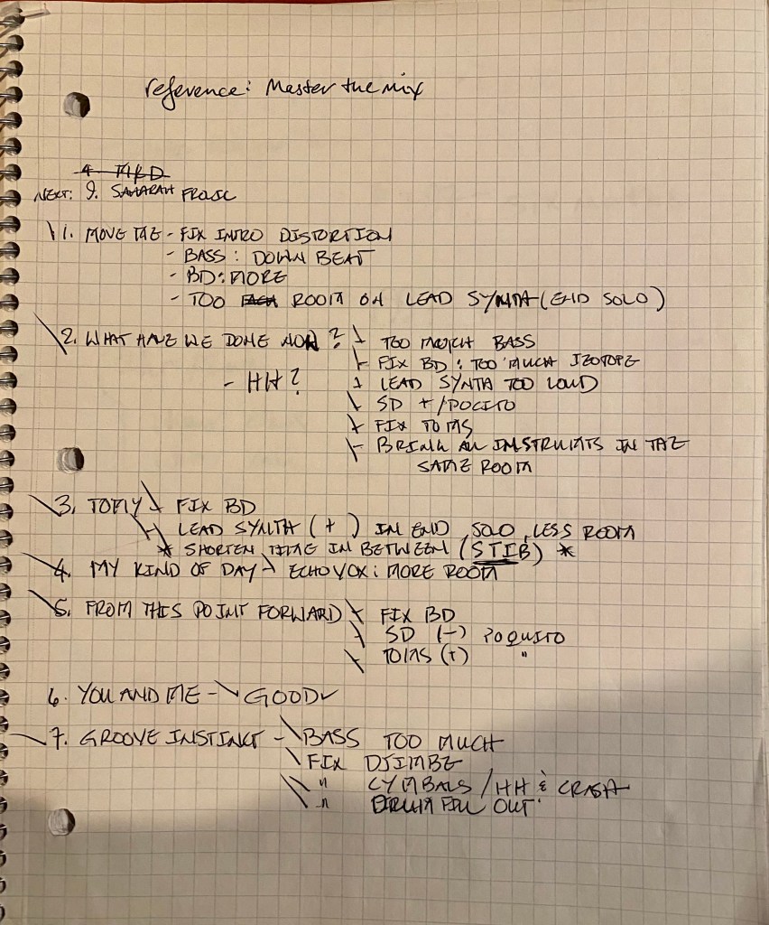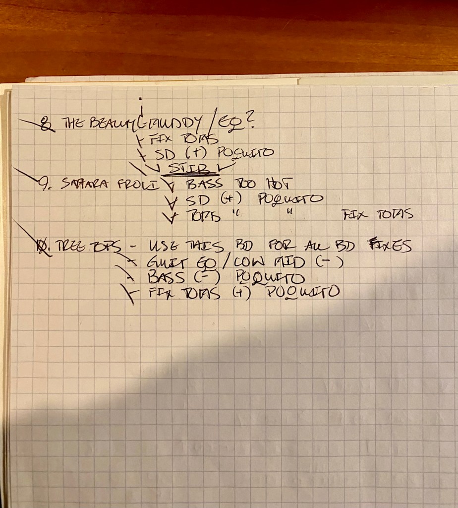 The photo’s in the beginning and in between… Some of my lists of changes that needed to be made after a mix and master round. In the beginning there was not a list.. there was one task. To take a deep dive into all of the songs and carefully adjust the equalization and get out of the “Box”. Box as in the sound was not clear and concise… pretty crappy sound actually.
